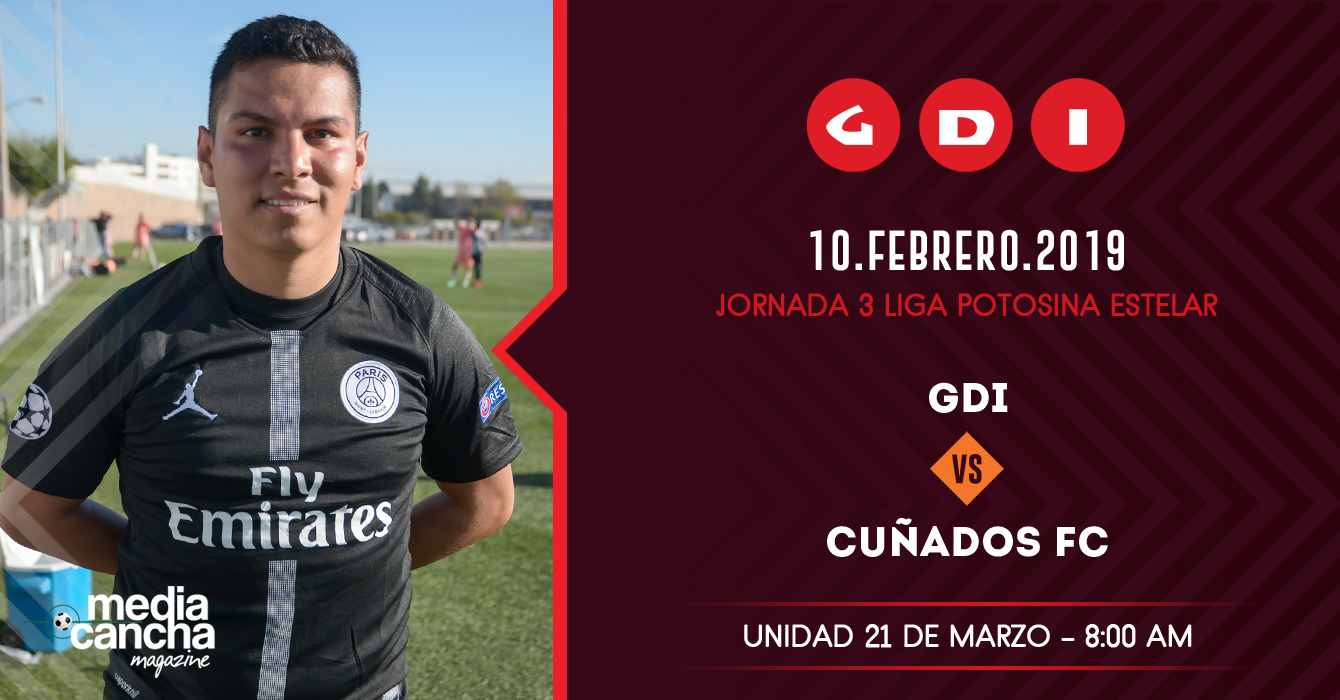 | 8 Febrero.- Un partido de fútbol muy emocionante es el que se espera este domingo para el equipo de GDI cuando enfrente al equipo de Cuñados FC, un encuentro en donde se espera que el equipo de GDI termine por convencer en su funcionamiento, así como también pueda salir airoso con las 3 unidades. Tras obtener sus primeros 3 puntos del torneo, el equipo de GDI esta listo para este domingo poder seguir sumando unidades las cuales le permitan seguir escalando posiciones y así volver a demostrar el por que es una de las escuadras contendiente al título en la liga Potosina. Este domingo 10 de febrero su partido correspondiente a la fecha 3 será en la cancha de la Unidad 21 de marzo en punto de las 08:00 hrs. |