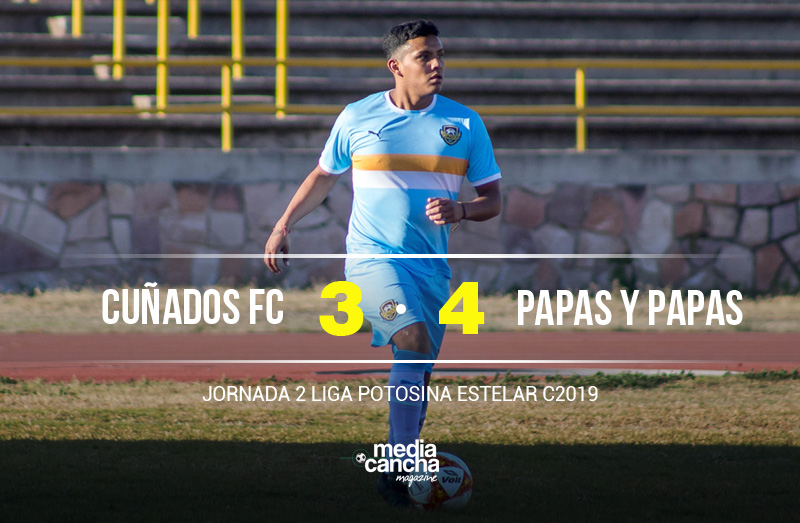 | No ha sido uno de los mejores comienzos de Cuñados FC, en el partido correspondiente a la fecha 2 de la categoría estelar de la Liga Potosina cae con marcador 4 a 3 ante Papas y Papas. Fue un duelo de grandes, sin duda la nueva liga le ha venido bien a cuñados ya que a pesar de las dos derrotas se ha visto duramente exigido por lo que el nivel de la escuadra ha ido en incremento, sólo será cuestión de tiempo para que Cuñados se embale y empiece a sumar puntos. Los goles del equipo Cuñados fueron dos de Jorge Gómez y uno para Javier Ortíz. |
