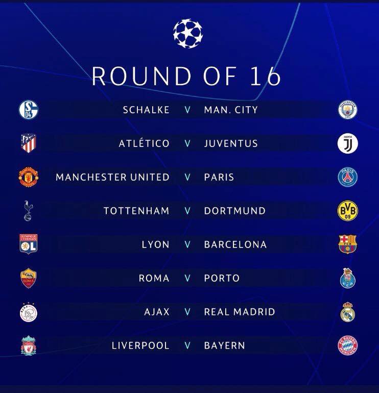 | IDA Martes, 12 de febrero Manchester United (ING) - Paris Saint Germain (FRA) Roma (ITA) - Porto (POR) Miércoles, 13 de febrero Ajax (HOL) - Real Madrid (ESP) Tottenham Hotspur (ING) - Borussia Dortmund (ALE) Martes, 19 de febrero Olympique Lyon (FRA) - FC Barcelona (BAR) Liverpool (ING) - Bayern Múnich (ALE) Miércoles, 20 de febrero Atlético de Madrid (ESP) - Juventus (ITA) Schalke (ALE) - Manchester City (ING) VUELTA Martes, 5 de marzo Real Madrid (ESP) - Ajax (HOL) Borussia Dortmund (ALE) - Tottenham Hotspur (ING) Miércoles, 6 de marzo Paris Saint Germain (FRA) - Manchester United (ING) Porto (POR) - Roma (ITA) Martes, 12 de marzo Juventus (ITA) - Atlético de Madrid (ESP) Manchester City (ING) - Schalke (ALE) Miércoles, 13 de marzo FC Barcelona (ESP) - Olympique Lyon (FRA) Bayern Múnich (ALE) - Liverpool (ING) |